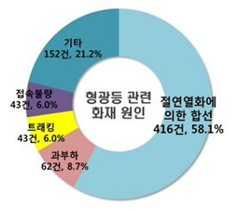 형광등 화재의 주요원인으로는 안정기가 있습니다. 형광등을 교체해도 불빛이 깜빡이거나 이상한 소리가 나는 것은 안정기 문제일 수 있습니다. 2012년부터 2014년 까지 한국소비자원에서 형광등 화재를 분석한 결과 전체 767건 중 716건 (93.4%)이 형광등기구 부품의 합선, 과열 등에 의한 전기화재사고로 분석 되었습니다.